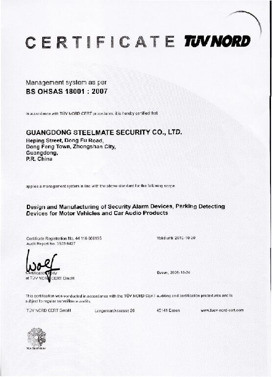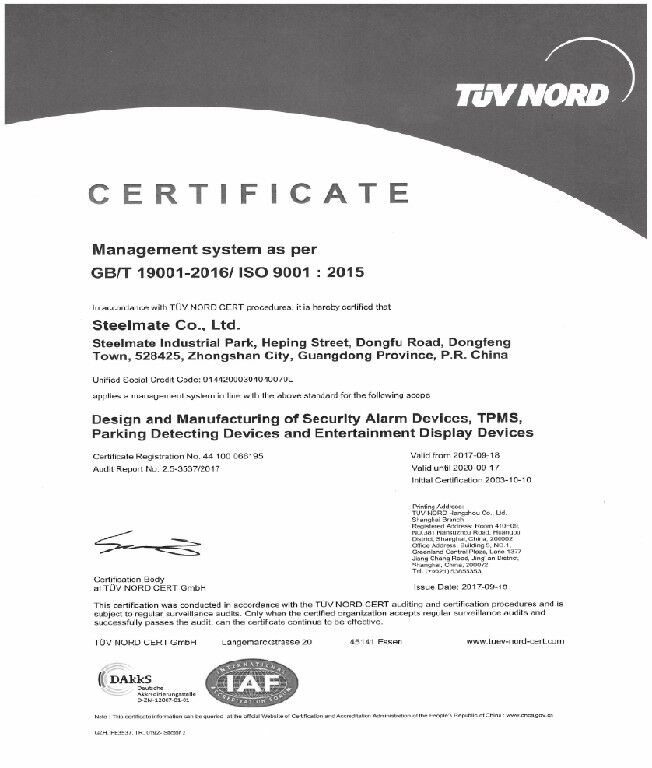 STEELMATE CO.,LTD. se fundó en Zhongshan, provincia de Guangdong, China, con un capital registrado de 80 millones de yuanes. Es una empresa nacional acreditada de alta tecnología (HNTE) y un centro provincial de I+D en tecnología de ingeniería. Además, es miembro del comité de redacción de la norma nacional obligatoria china para TPMS (GB26149-2017 Requisitos de rendimiento y métodos de prueba del sistema de monitoreo de presión de neumáticos para automóviles de pasajeros), y estableció el Centro de Pruebas Steelmate acreditado por CNAS para realizar pruebas y calibraciones bajo la norma ISO 17025. Con una sólida capacidad de I+D, ha obtenido varias patentes de invención y patentes de modelo de utilidad. Además, su parque industrial abarca un área de 185 acres (120 000 m²) con aproximadamente 1000 empleados, y alberga varios centros de fabricación inteligentes equipados con decenas de líneas de producción automatizadas avanzadas.