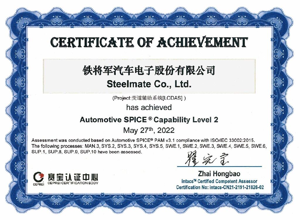También hemos obtenido la certificación A-SPICE Nivel 2, que verifica la capacidad de Steelmate para proporcionar software seguro y confiable para la electrónica automotriz y puede brindar a los clientes nacionales e internacionales tecnología profesional y servicios de calidad.